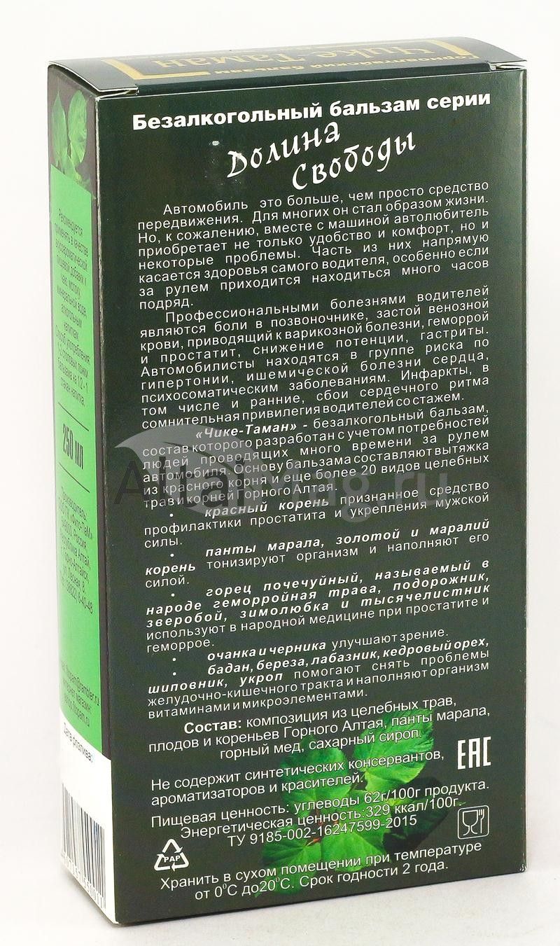 - Безалкогольный бальзам Чике-Таман приготовлен на основе алтайских трав и горного меда. Композиция растений подобрана с учетом потребностей организма людей, проводящих много времени в автомобиле.