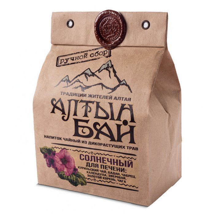Напиток чайный из дикорастущих растений, для печени. Нормализует работу печени и желчного пузыря, очищает желчевыводящие пути, способствует выведению токсинов из организма. Состав: зверобой, календула, чага, курильский чай, золотой корень, бадан, чабрец.