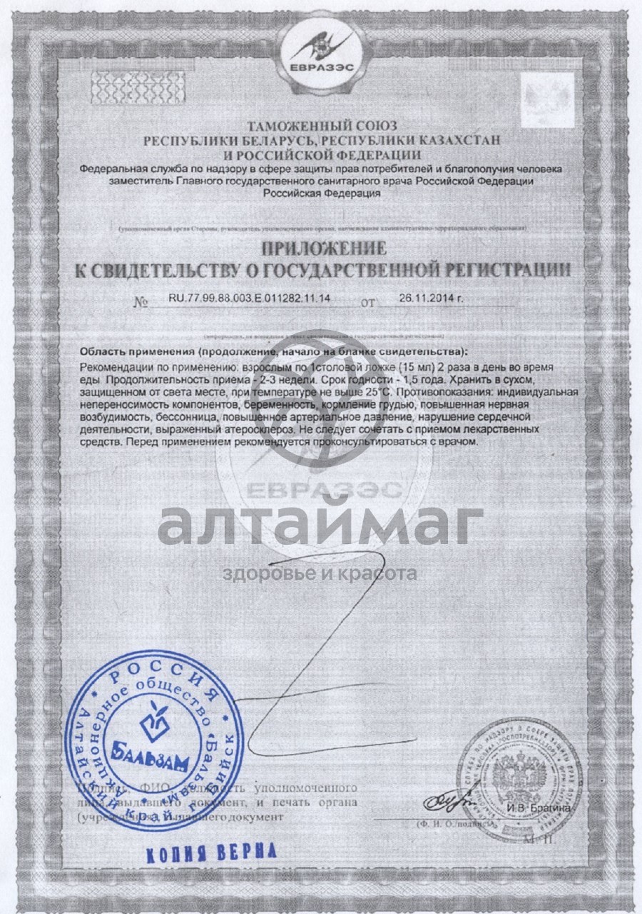 Регулярный приём сиропа делает организм менее подверженным стрессам, простудным заболеваниям и значительным физическим и умственным нагрузкам. Активизируется кровообращение и постепенно уходят головные боли.