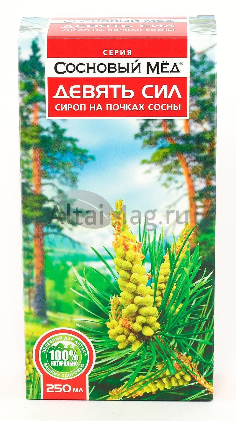 Сироп «Девять сил» входит в серию натуральных сиропов Сосновый мёд. Их основа - сосновые почки и лекарственные травы Горного Алтая.
