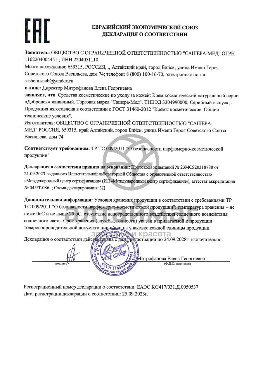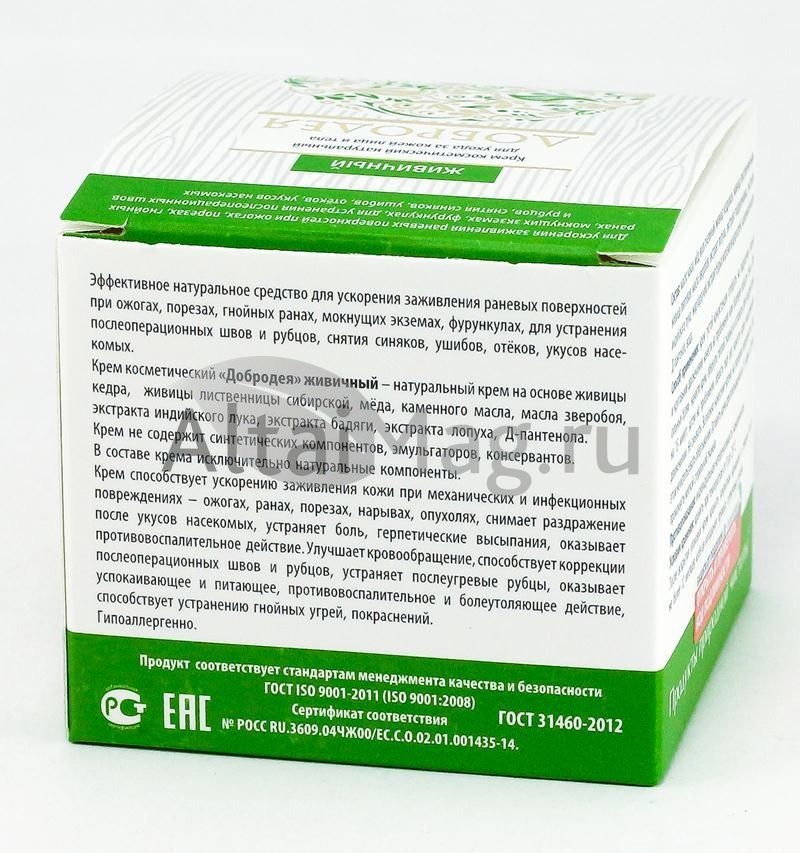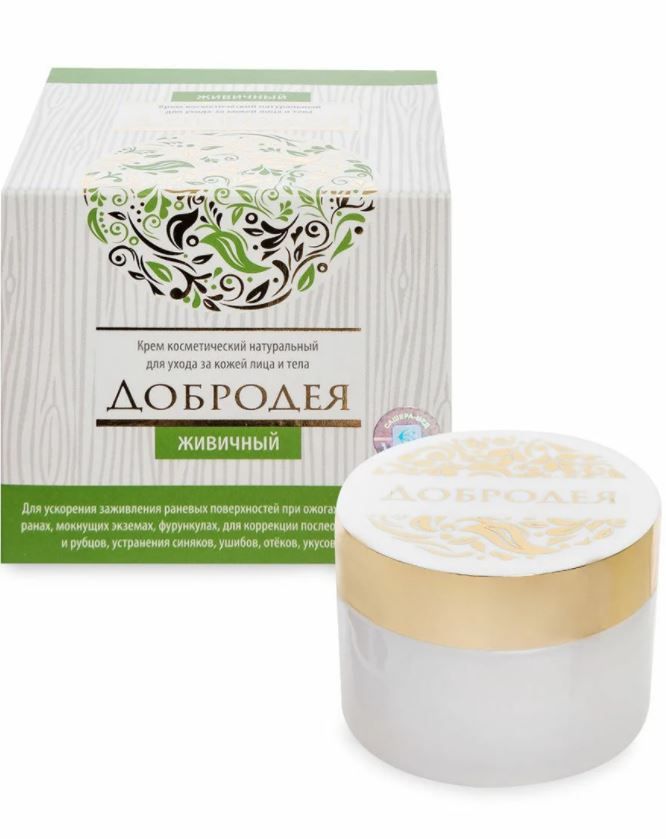 Крем косметический «Живичный» серии «Добродея» - натуральный крем на основе живицы кедра, живицы лиственницы сибирской, меда каменного масла, масла зверобоя, экстракта индийского лука, экстракта бадяги, экстракта лопуха, Д-пантенола. Крем не содержит синтетических компонентов, эмульгаторов, консервантов.