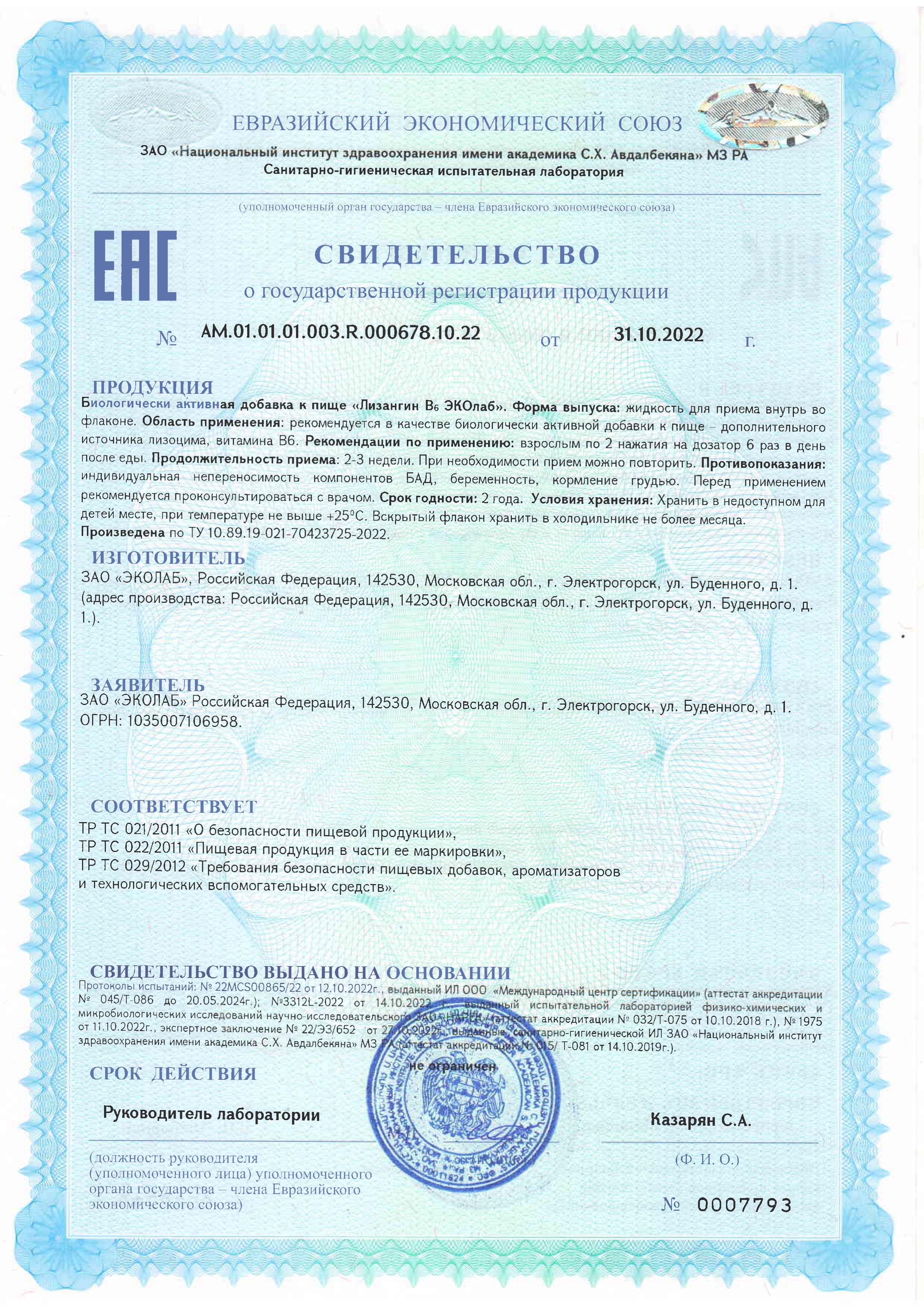 ЛИЗАНГИН В6 ЭКОЛАБ - Биологически активная добавка (БАД) к пище - комбинированный антисептик на основе природного компонента лизоцима