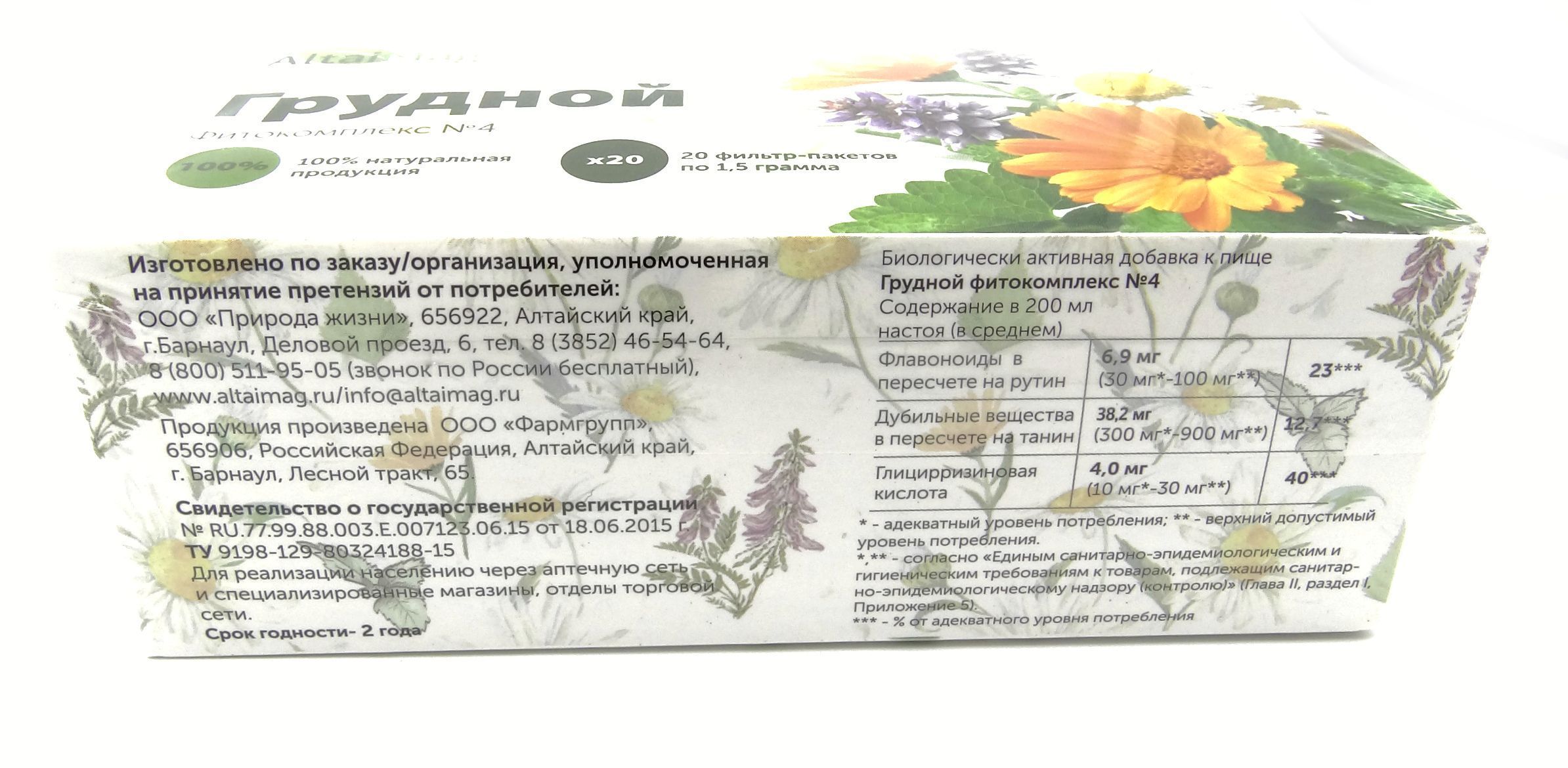 - Чтобы купить Грудной сбор №4 АлтайМаг 20 пакетиков совершите всего несколько шагов: укажите количество продукта и нажмите на кнопку «Купить».