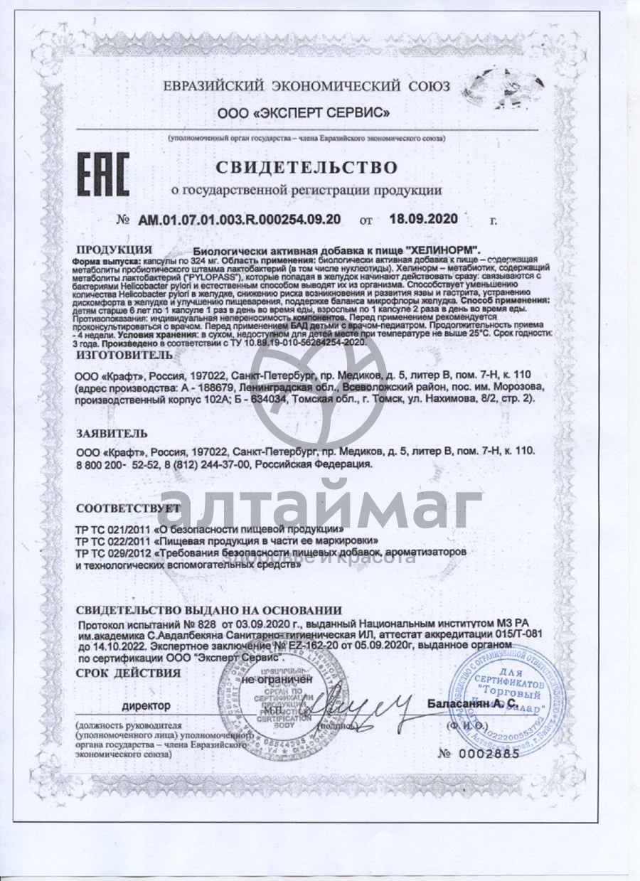 Особые бактерии в составе Хелинорма обладают специфическим антихеликобактерным действием. Попадая в организм, они распознают вредные бактерии Хеликобактер пилори, сцепляются с ними, образуя ко-агрегаты, и естественным способом выводят их из организма.Исследования показали, что даже двухнедельный прием таких специальных бактерий снижает уровень Хеликобактер пилори в организме, а эффект сохраняется в течение 6 месяцев после его окончания.