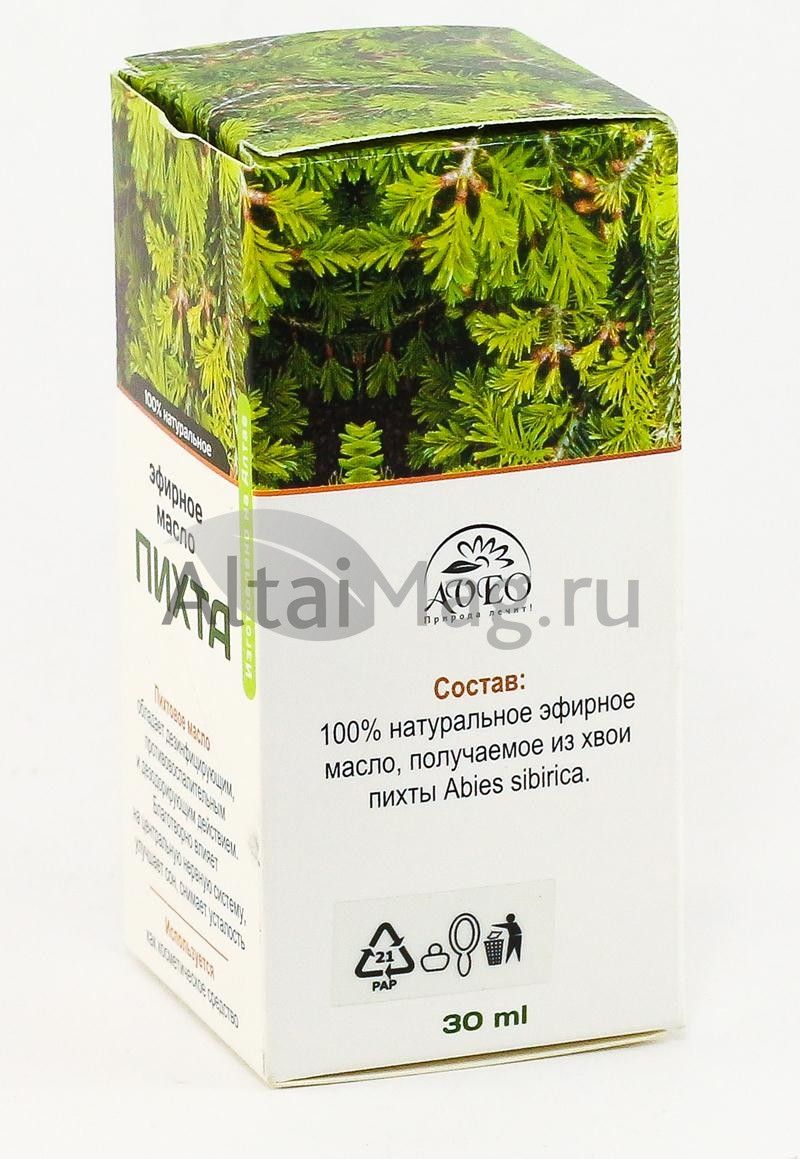 Пихтовое масло «Алтайское» получают из хвои и молодых побегов пихты. Этот ценнейший экстракт люди издавна используют как дезинфицирующее и косметическое средство очень высокой биологической активности. Пихтовое масло «Алтайское», вобрав в себя более 35 биологически активных соединений в сбалансированном соотношении, имеет ряд ценнейших свойств. Женщины найдут в пихтовом масле идеальное косметическое средство, которое в короткий срок поможет избавиться от морщин и дряблости кожи. Масло создает неповторимый запах свежего леса и применяется для дезодорации, обеззараживания воздуха в жилых помещениях и салонах автомобилей, благотворно влияет на центральную нервную систему, улучшает сон, имеет тонизирующее свойство, хорошо расслабляет мышцы, снимает усталость, устраняет последствия стрессовых факторов.