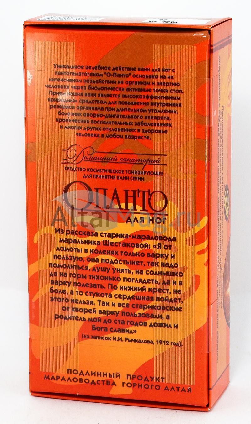 Ванны для ног «О-ПАНТО» имеют ярко выраженный эффект при наличии многих заболеваний, полученный результат стабилен и не исчезает по окончании курса. Это высокоэффективное природное средство для повышения внутренних резервов и защитных сил организма при длительном утомлении, болезнях опорно-двигательного аппарата, хронических воспалительных заболеваниях и многих других отклонениях в здоровье человека в любом возрасте.