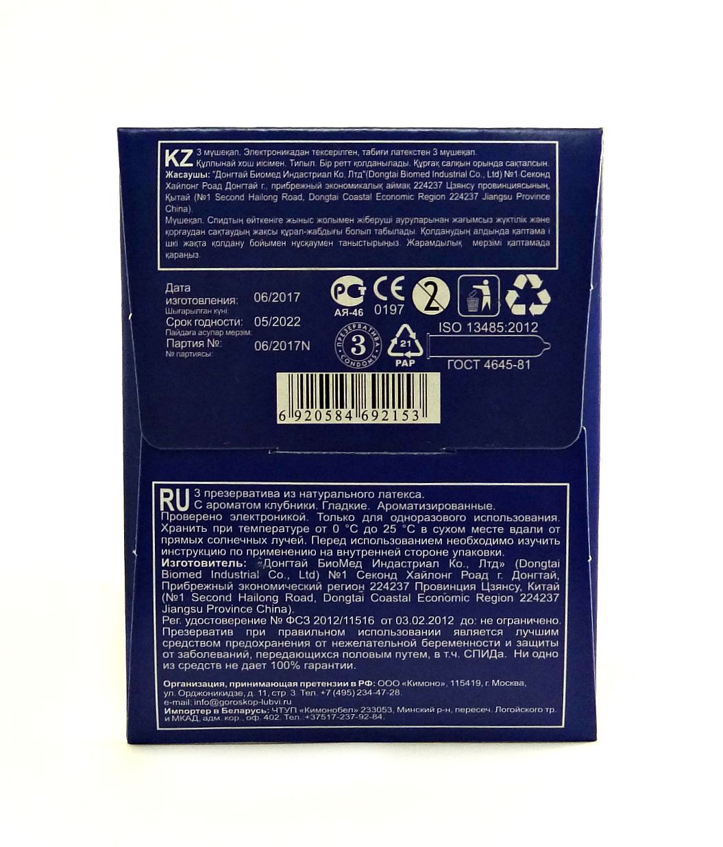 3 презерватива из натурального латекса в силиконовой смазке с ароматом клубники. В блоке 48шт с точечной и гладкой текстурой поверхности.