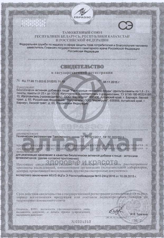 Расторопшу пятнистую используют при пищевых отравлениях, хронической интоксикации, приобретенных иммунодефицитах, желчных камнях, кашле, ухудшении зрения, токсикозах беременных, а также для лечения ожирения, сахарного диабета, болезней печени и селезенки, желтухи, сердечно-сосудистых и других заболеваний. Расторопшу используют для очистки печени, крови и всего организма от токсинов, радиации, после прохождения курса химио- или лучевой терапии, для лечения варикозного расширения вен, тяжело заживающих язв и при открытых переломах нижних конечностей.Состав: