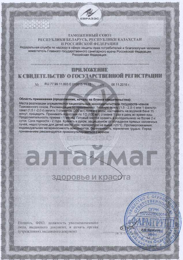 1 фильтр-пакет (1,5-2,0 г) продукта залить 1 стаканом горячей воды, настоять на водяной бане 15 минут, процедить. Взрослым принимать по ½ стакана 1 раз в день во время еды. Готовый настой хранить в холодильнике не более 2-х суток. Продолжительность приема – 1 месяц.Противопоказания: