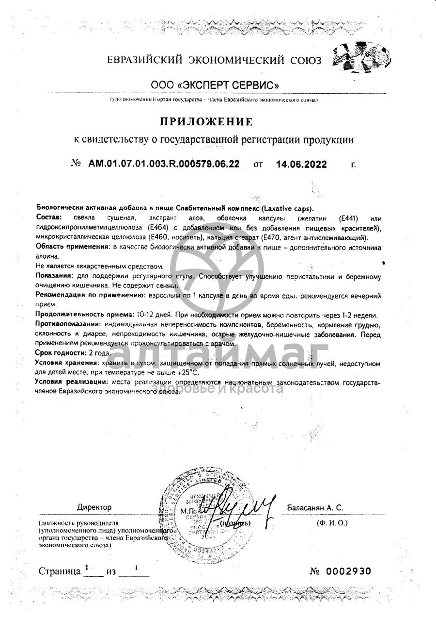 Слабительный комплекс «Laxative caps» для поддержки регулярного стула. Способствует улучшению перистальтики и бережному очищению кишечника. Не содержит сенны. Рекомендовано качестве биологически активной добавки к пище - дополнительного источника алоина.
