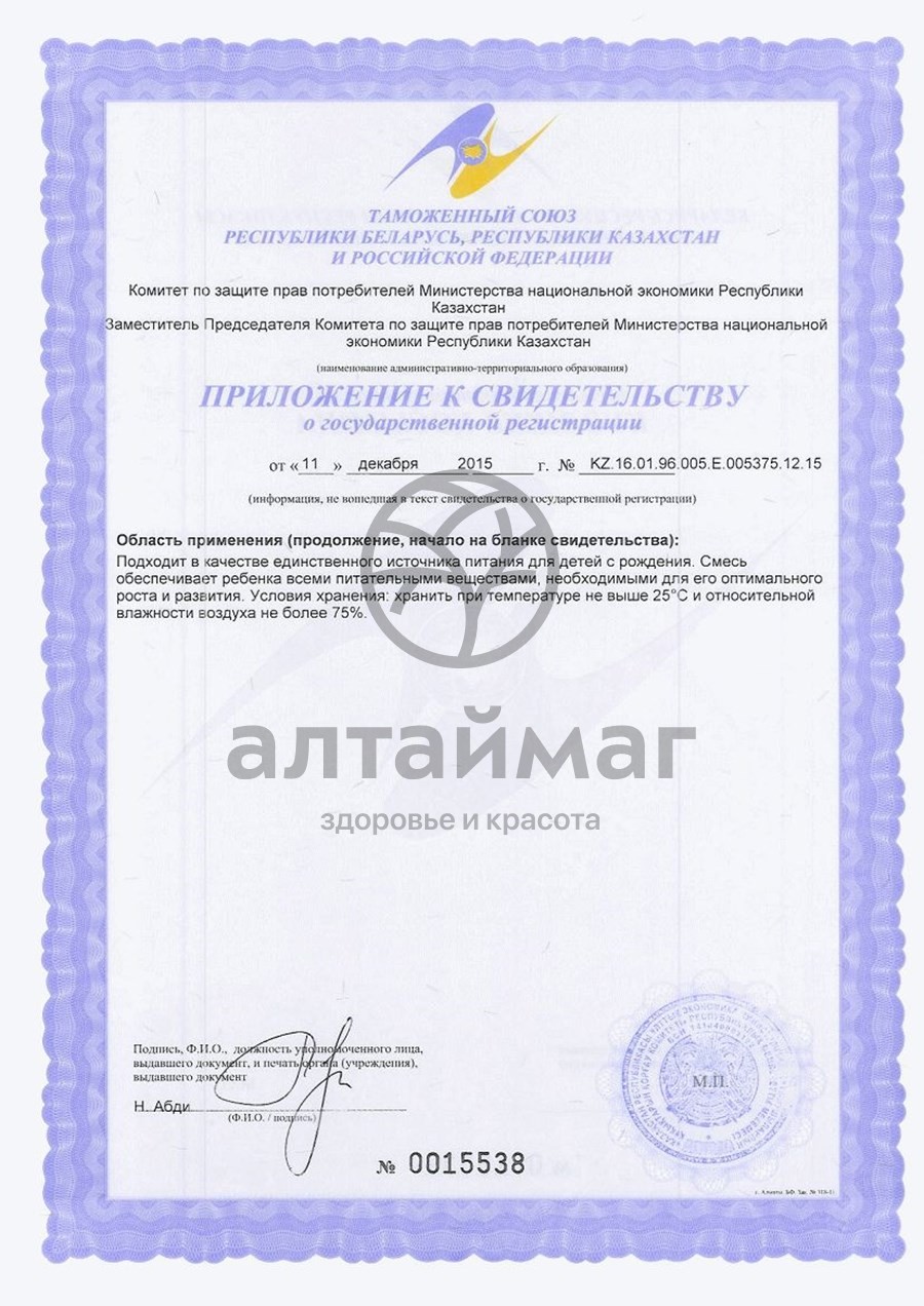 Лактоза, растительные масла (подсолнечное высокоолеиновое, кокосовое, низкоэруковое рапсовое, подсолнечное), крахмал картофельный, частично гидролизованный белок молочной сыворотки, фосфат кальция, хлорид магния, хлорид калия, L-аргинин, гидроксид натрия, витамины (С, пантотеновая кислота, РР, Е, В2, A, В1, В6, фолиевая кислота, Д3, К1, В12, биотин), хлорид натрия, L-гистидин, холин, L-тирозин, гидрофосфат калия, таурин, инозит, L-карнитин, сульфат железа, сульфат цинка, нуклеотиды, лактобактерии L.reuteri (не менее 106sup> КОЕ/г), сульфат меди, сульфат марганца, йодид калия, селенат натрия. Упаковано в модифицированной атмосфере с азотомХарактеристики: