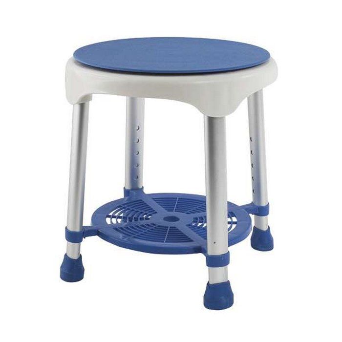 Стул для ванны является полностью разборным. Ножки стула съемные, на ножках установлены противоскользящие насадки. Сиденье вращающееся. Также в комплект входит полочка для принадлежностей, устанавливающаяся на ножках изделия. Продается в индивидуальной упаковке. Шаг регулировки высоты - 2 см, регулировка по высоте 41-51 см. Размеры сиденья: диаметр 36 см. Максимальная нагрузка - 120 кг.
