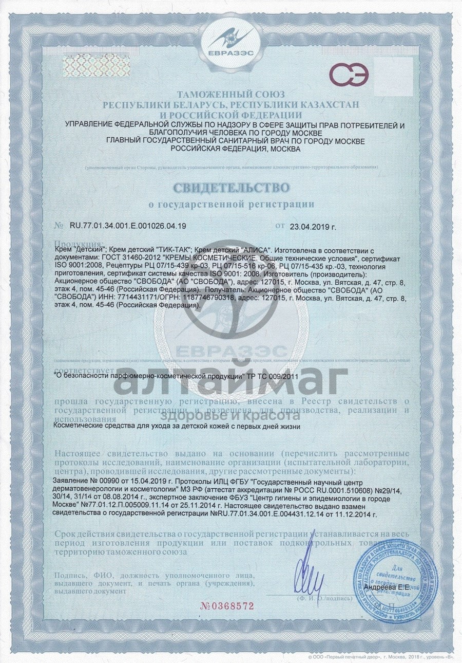 Обратите внимание, на рынке детской косметики появился крем "Детский" от компании ООО "НПО АДЕЛЕЙД" с тождественным названием и сходным дизайном. Данный продукт наносит вред имиджу компании ОАО "Свобода", так как данный крем не является аналогом крема "Детский" от ОАО "Свобода" и имеет большие отличия в составе, запахе и рекомендациях по использованию. Будьте внимательны!!!