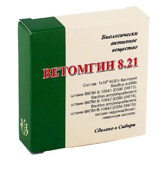 Ветомгин 8.21 поставляет в кишечник полезные штаммы Bacillus subtilis и Bacillus amyloliquefaciens. Эти микроорганизмы восстанавливают здоровую кишечную микрофлору, подавляют размножение патогенных микроорганизмов, устраняют симптомы воспаления и вздутия, нормализуют стул. При курсовом приеме способствуют росту иммунитета.